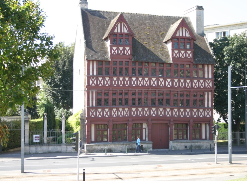 Le rythme des ouvertures du premier étage a semble-t-il été modifié lors de la reconstruction : deux pans aveugles, à chaque extrémité encadrent une série de baies, de largeurs différentes, deux, trois, trois, trois, trois, deux vantaux. (Les photos d’avant-guerre font apparaître une autre scansion avec présence de pans en torchis ou de plâtre). Les potelets alternant avec les poteaux soulignent cette répartition. Les uns et les autres sont sobrement décorés de quelques moulures. Les allèges sont renforcées par des croix de Saint André.
