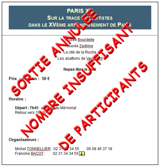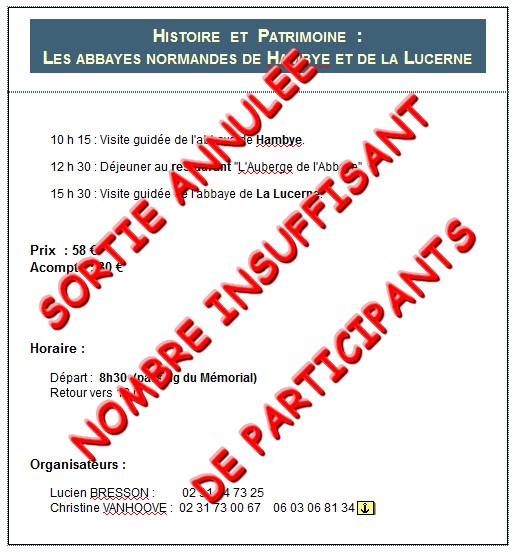parking du Mémorial (à préciser en janvier) Organisatrice : Ghislaine LOUVET 02 31 37 34 01 06 32 35 01 87 (le jour de la sortie) |